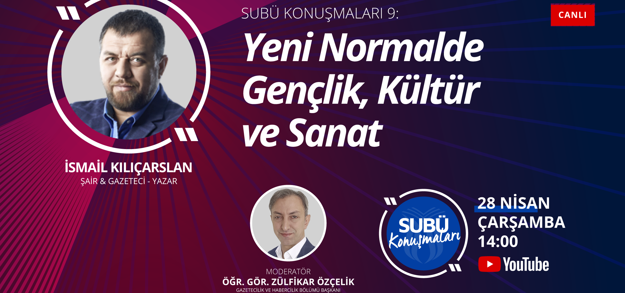 SUBÜ Konuşmaları’nın 9. konuşmacısı ‘Yeni Normalde Gençlik, Kültür ve Sanat’ başlıklı söyleşiyle şair, gazeteci, senaryo yazarı, televizyon programı sunucusu ve Yeni Şafak Gazetesi köşe yazarı İsmail Kılıçarslan olacak. Söyleşi 28 Nisan Çarşamba saat 14.00’da YouTube kanalı SUBÜ Haber’den canlı yayınlanacak.