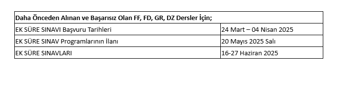2024-2025 BAHAR YARIYILI AZAMİ SÜRE EK SÜRE SINAV TAKVİMİ