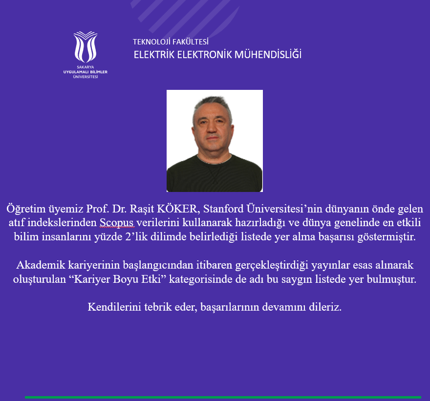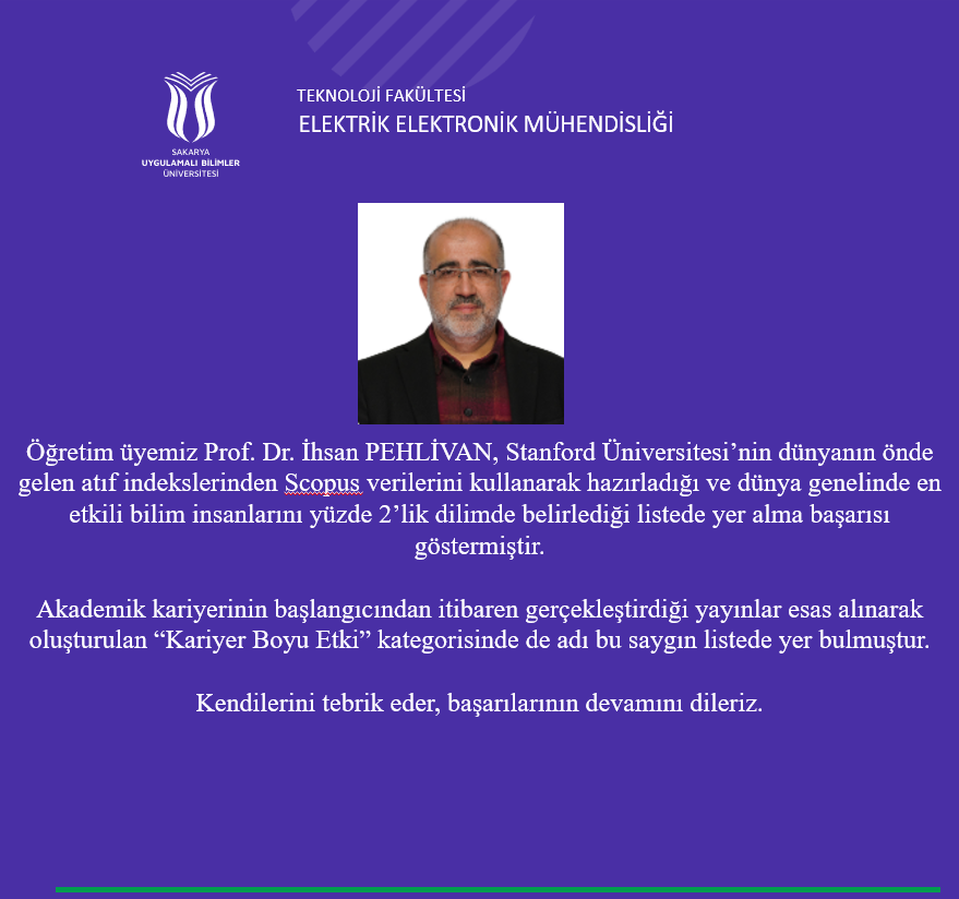 Sakarya Uygulamalı Bilimler Üniversitesi (SUBÜ) Teknoloji Fakültesi Elektrik ve Elektronik Mühendisliği Bölümü’nden iki değerli akademisyenimiz, Prof. Dr. İhsan Pehlivan ve Prof. Dr. Raşit Köker, dünya genelinde büyük bir başarıya imza attı. Stanford Üniversitesi'nin Scopus verilerine dayanarak hazırladığı ve dünyanın en etkili bilim insanlarının yer aldığı yüzde 2'lik dilimde bulunan akademisyenleri içeren listeye, her iki hocamız da dâhil oldu. Elsevier BV tarafından yayınlanan ‘Kariyer Boyu Etki’ listesinde yer alan Prof. Dr. İhsan Pehlivan ve Prof. Dr. Raşit Köker, akademik kariyerlerinin başından itibaren yaptıkları önemli bilimsel çalışmalarla bu başarıya ulaşmıştır.