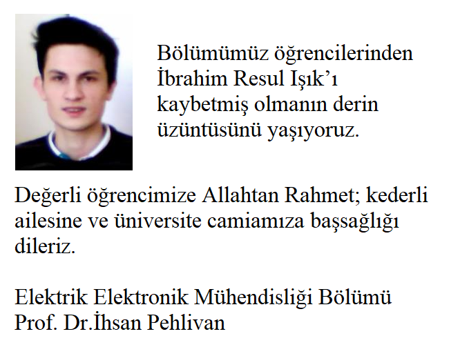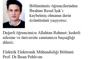 Bölümümüz öğrencilerinden İbrahim Resul Işık’ı kaybetmiş olmanın derin üzüntüsünü yaşıyoruz.