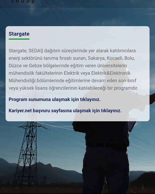 Duyuru linki https://www.sedas.com/tr-tr/ik/Pages/stargate.aspx?fbclid=IwAR1JKTAUH6-XZd_hZthcQQw-iWnVZBcrkqUfzr_uFhpNRTKgmt4W1a4feTs Galeri