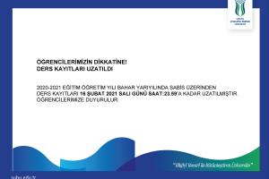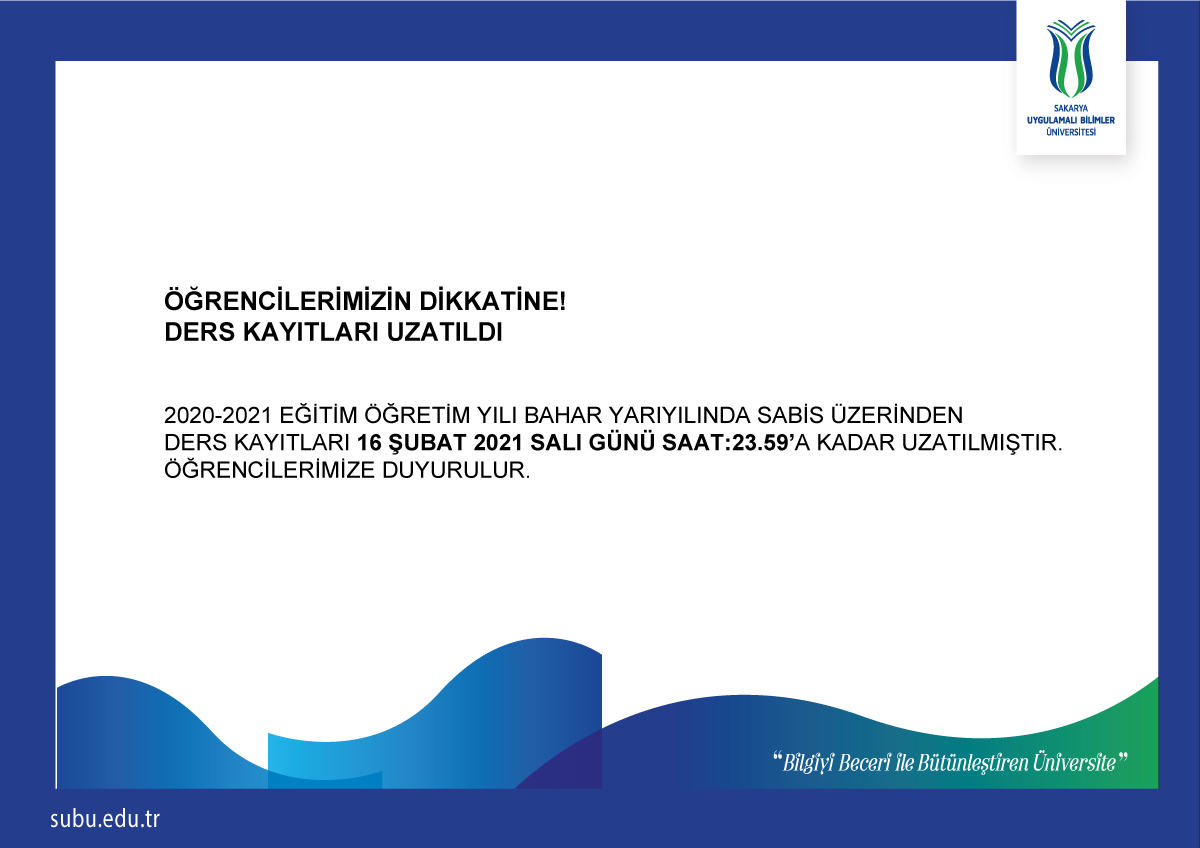 Ders kayıtları uzatılması ile ilgili duyuru ekte verilmiştir. Ana linki ise; https://ogrisl.subu.edu.tr/tr/duyuru/ogrencilerimizin-dikkatine-ders-kayitlari-uzatildi Galeri