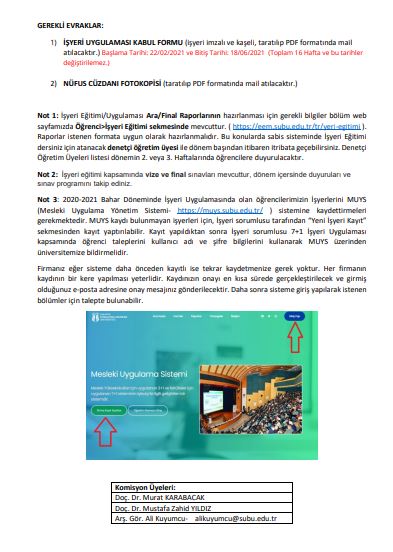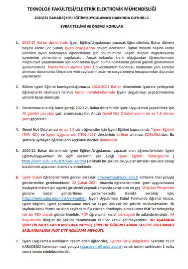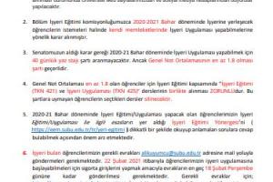 2020/21 BAHAR-İŞYERİ EĞİTİMİ/UYGULAMASI HAKKINDA DUYURU-1 EVRAK TESLİMİ VE ÖNEMLİ KONULAR