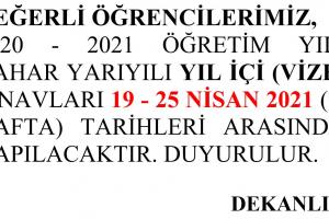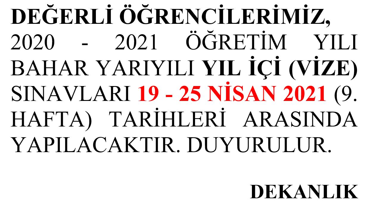 DEĞERLİ ÖĞRENCİLERİMİZ, 2020 - 2021 ÖĞRETİM YILI BAHAR YARIYILI YIL İÇİ (VİZE) SINAVLARI 19 - 25 NİSAN 2021 (9. HAFTA) TARİHLERİ ARASINDA YAPILACAKTIR. DUYURULUR. DEKANLIK Galeri