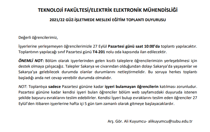 2021/22 GÜZ-İŞLETMEDE MESLEKİ EĞİTİM TOPLANTI DUYURUSU