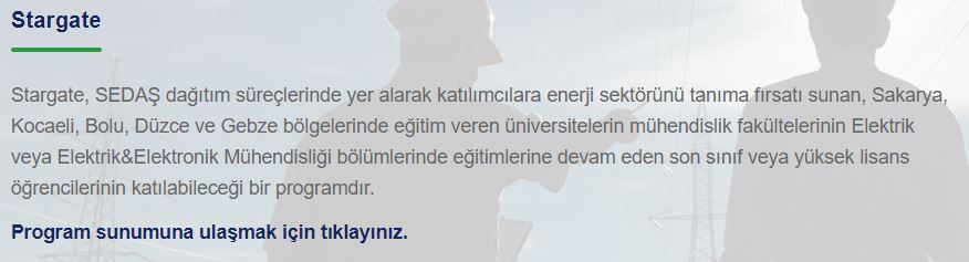 Sakarya Elektrik Dağıtım A.Ş., geçen sene olduğu gibi bu senede Stargate sürecine başlayacak. 8 Şubat 2022 son başvuru tarihi olacaktır. Mart ayının ortasında ise programa başlanması hedeflenmekdir. Gerekli bilgiye https://www.sedas.com/tr-tr/ik/Pages/stargate.aspx linkinden ulaşabilirsiniz. Başvurular kariyer.net üzerinden olup ilana https://www.kariyer.net/is-ilani/sakarya-elektrik-dagitim-a-s-sedas-enerjimizin-parlayan-yildizi-olmaya-ne-dersin-2956943 üzerinden başvurabilirsiniz.