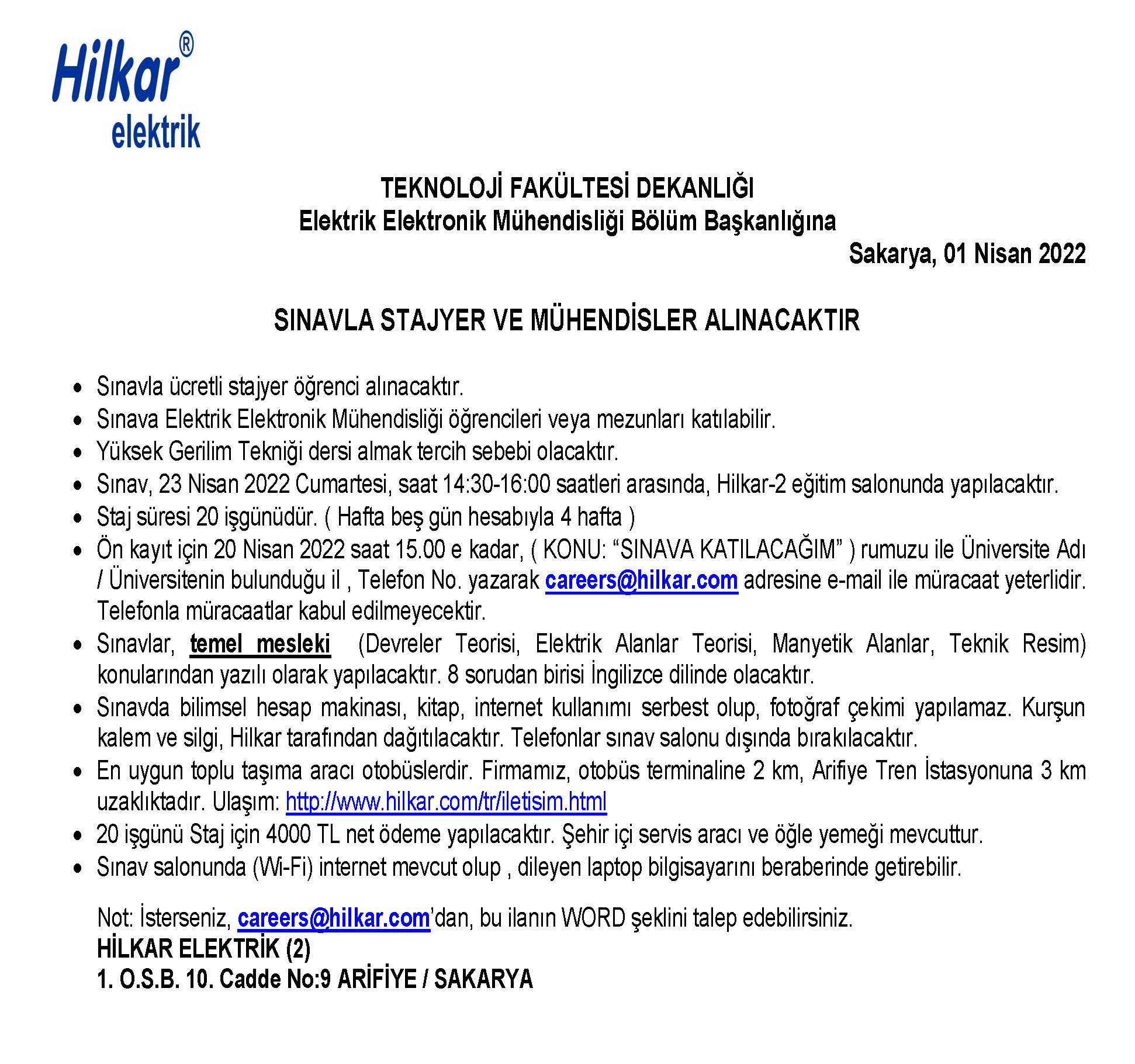 HİLKAR ELEKTRİK STAJ DUYURUSU